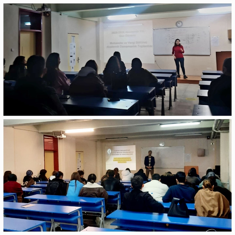 Akademik Danışmanlık İş Planı çerçevesinde Muhasebe ve Vergi Bölümü Muhasebe ve Vergi Uygulamaları Programı akademik danışmanları Öğr. Gör. Nuh Ali Türel ve Dr. Öğr. Üyesi Çiğdem Yerli tarafından 17 Aralık 2025 ve 22 Aralık 2025 tarihlerinde 2025-2026 Güz Dönemi Akademik Danışmanlık Toplantıları gerçekleştirilmiştir. Toplantıya 1.sınıf ve 2. sınıf öğrencilerinden toplam 54 kişi katılmıştır. Toplantıda;